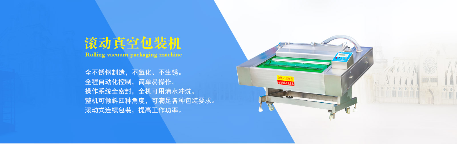 公司專業(yè)制造生產(chǎn)真空包裝機(jī)、拉伸膜真空包裝機(jī)、盒式真空包裝機(jī)、斬拌機(jī)、滾揉機(jī)、鹽水注射機(jī)、巴氏殺菌流水線等食品機(jī)械。其中生產(chǎn)的DZL-420全自動(dòng)拉伸膜真空包裝機(jī)、DZL-1000型連續(xù)自動(dòng)真空包裝機(jī)、真空滾揉機(jī)、斬拌機(jī)、鹽水注射機(jī)等都是通過(guò)本市技術(shù)監(jiān)督局檢驗(yàn)合格的產(chǎn)品。